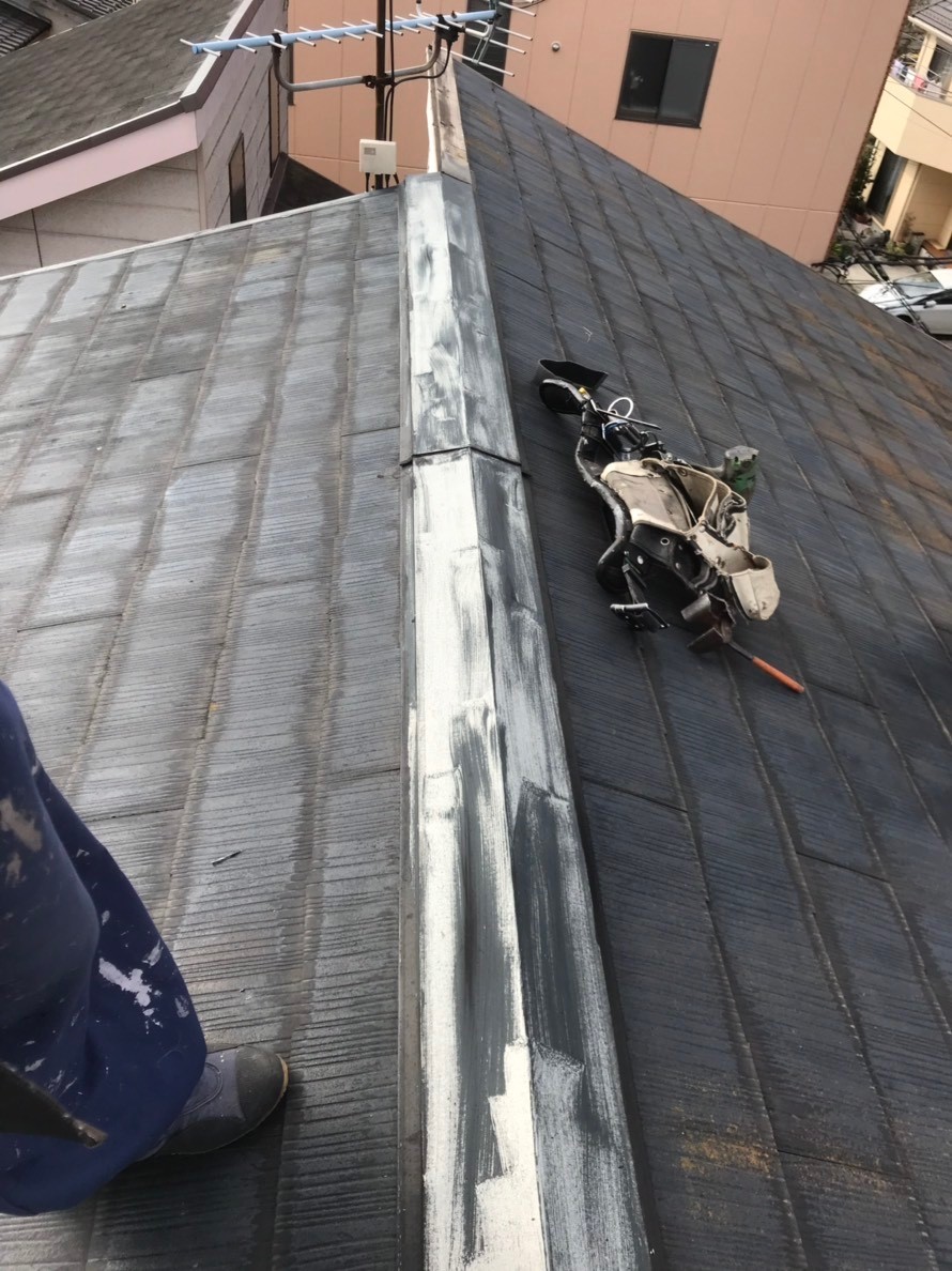 棟板金を取り付けた後、間にシリコンを打つことで固定、耐久性を強化します。