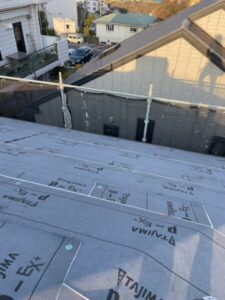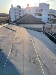 屋根材にはコーキング処理を施し、棟部分はルーフィングシートで仮防水を施している状態です。