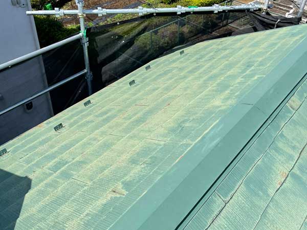 こちら現在はまだ雨漏りなど大きな被害こそ起きていませんが、屋根表面は劣化・色褪せが進んでいてカビも生えていました。